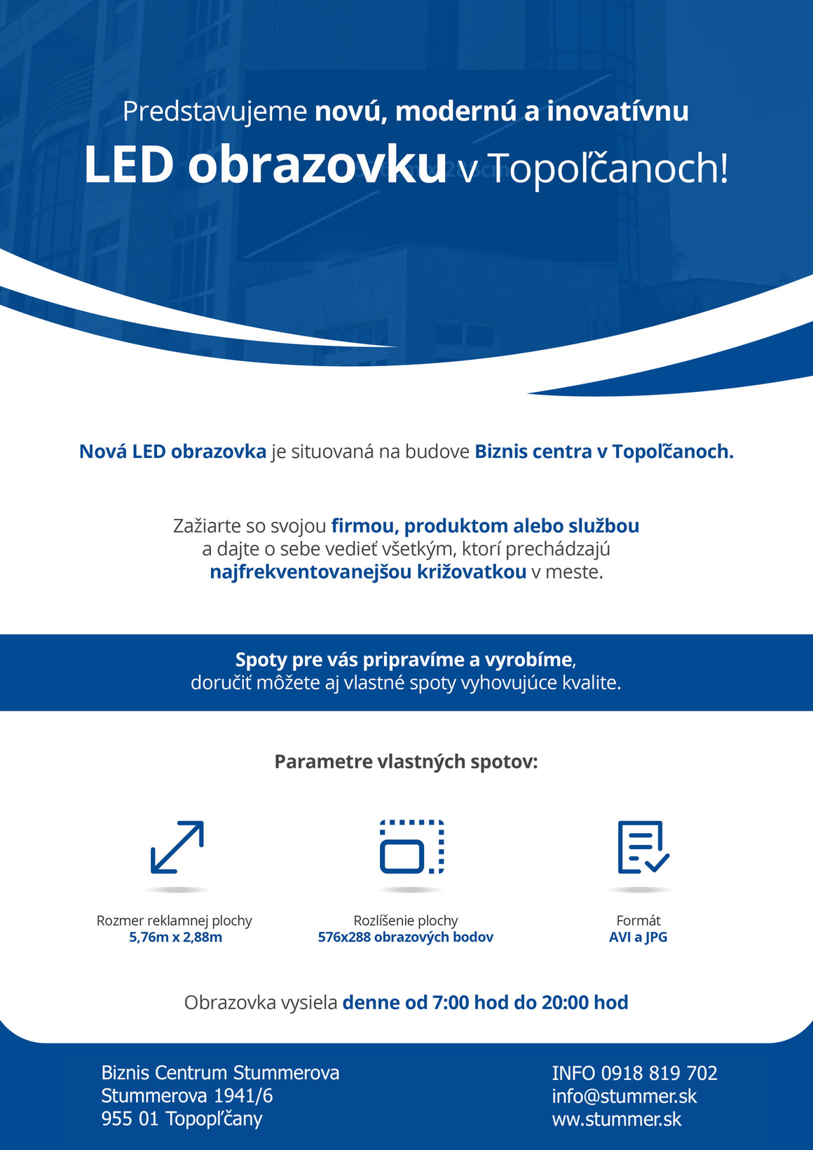 Naša obrazovka je umiestnená pri svetelnej križovatke ulíc Stummerova a ČSA v Topoľčanoch, priamo oproti hlavnému mestskému parkovisku.