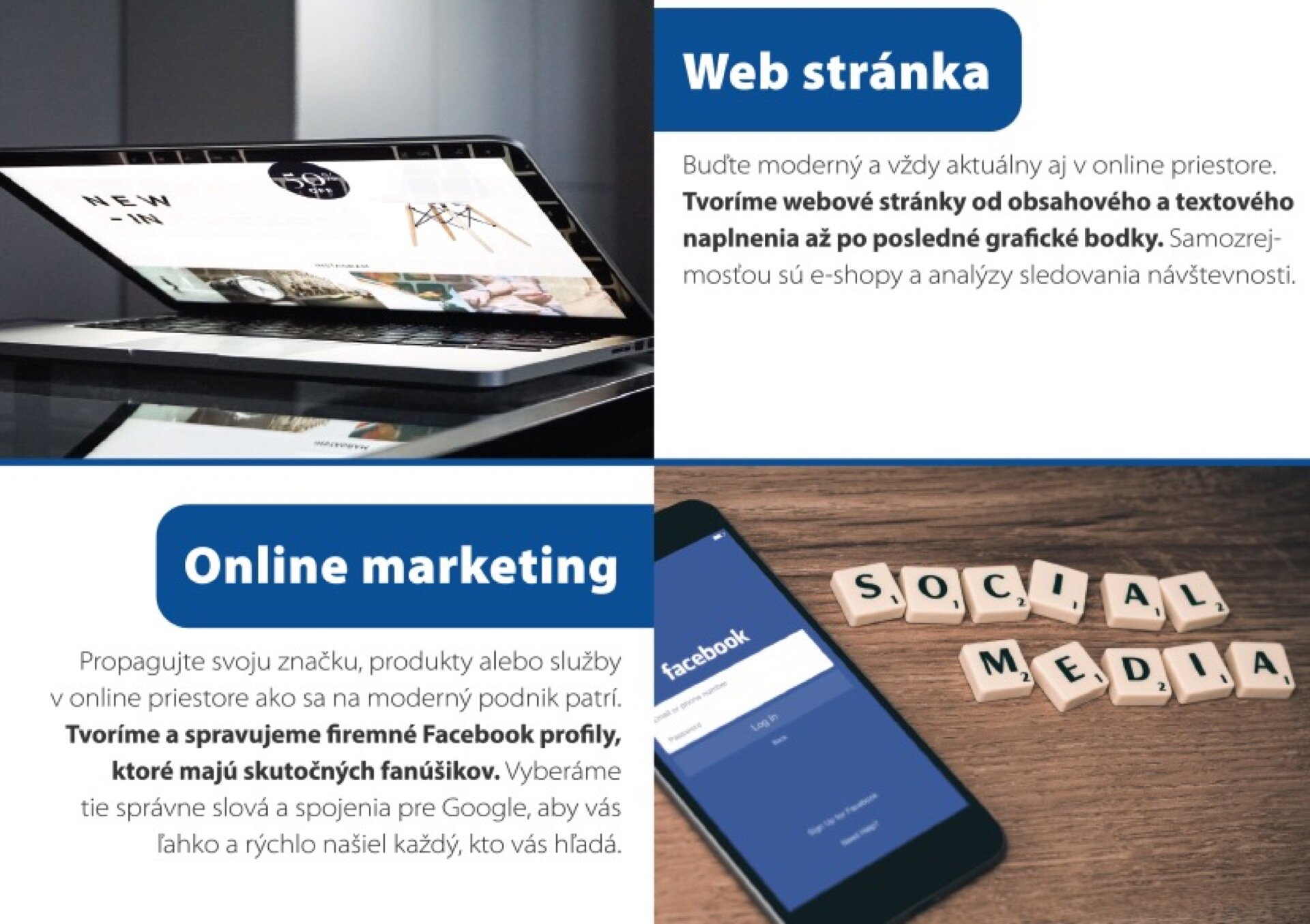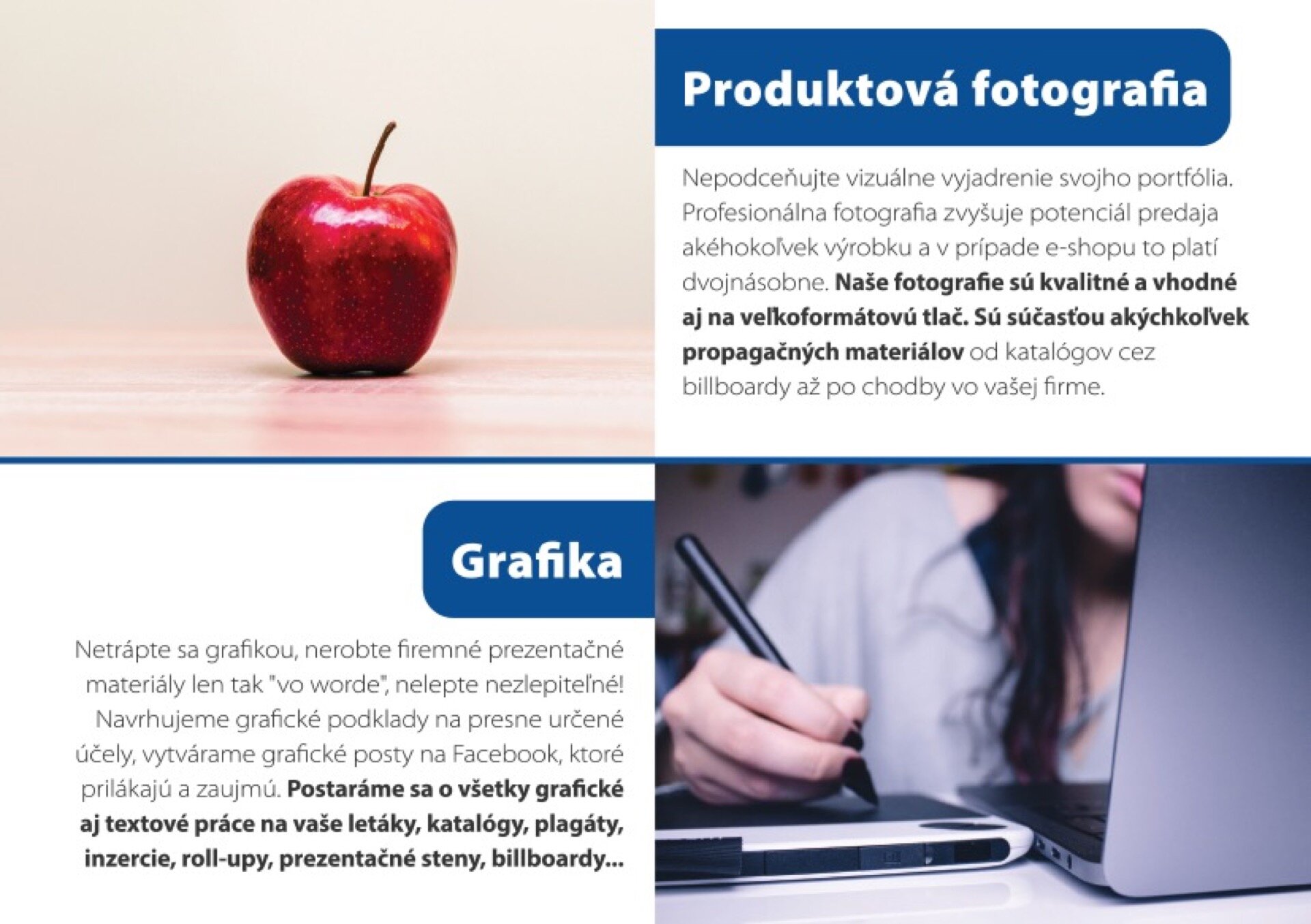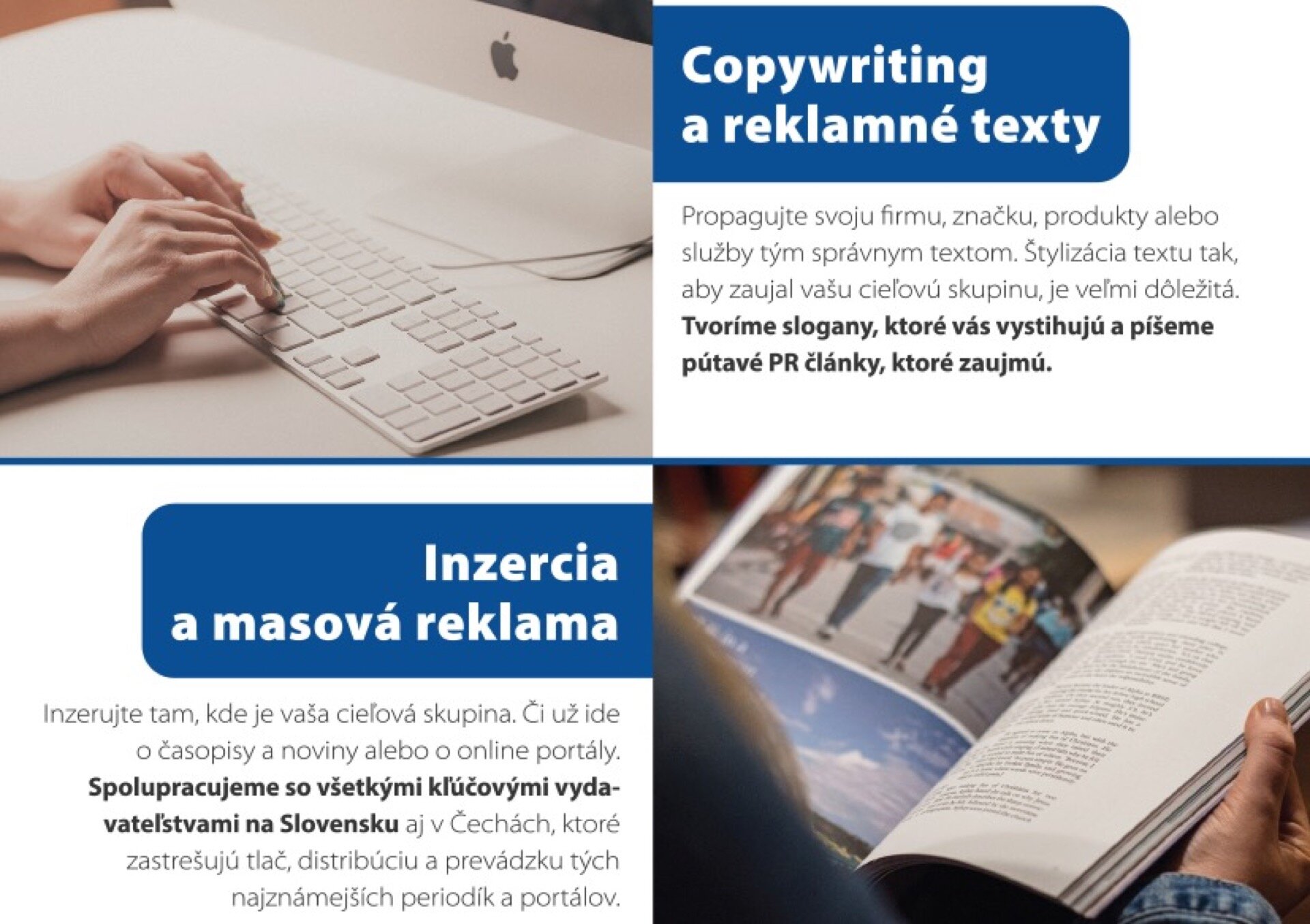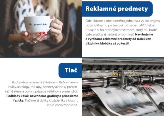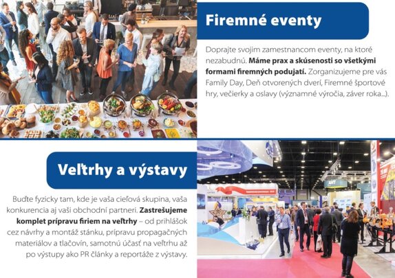 - Sme marketingová agentúra, ktorá sa postará o Váš marketing s happyendom. Poskytujeme služby v oblasti marketingovej produkcie / PR, ONLINE, GRAFIKA, FIREMNÉ VIDEÁ, ČASOPISY/ a organizácii eventov všetkých kategórií /VEČIERKY, FAMILY DAYS..